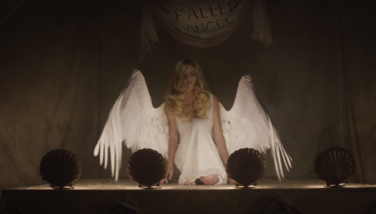 FX has premiered the first disturbing teaser trailer for American Horror Story: Freakshow. It's called "Fallen Angel," and it gives us a look at a young woman seemingly graced with angelic wings. Of course, the magic is taken away when you see that the wings are being operated by a creepy-ass clown! Yikes! This is going to be a sinister and dark chapter for the horror anthology series.