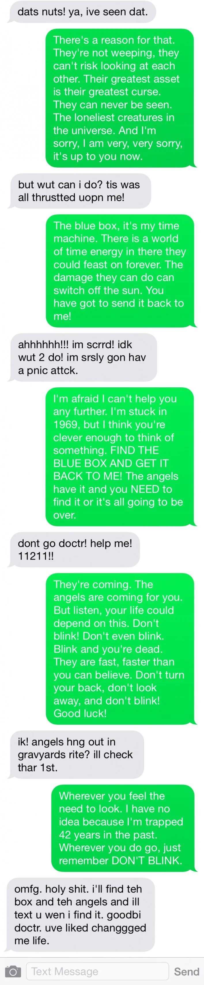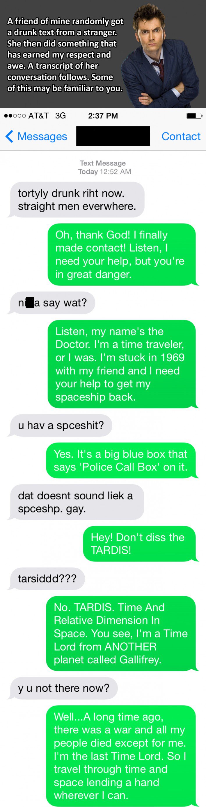 Few things are more annoying than getting a drunk text from a stranger in the middle of the night. They are thankfully rare and are usually best ignored. But if you’re bored and feel like messing with a poor, witless drunkard, this might be a fun thing to do. A Doctor Who fan received a mis-sent text that said, “tortyly drunk riht now. straight men everhwere.” Clearly, this was someone who needed to be messed with. Her friend posted screen grabs of the resulting conversation on tckld, and it is hilarious. Doctor Who fans will find one side of the conversation familiar. Even if you aren't a Doctor Who fan, this is pretty funny.