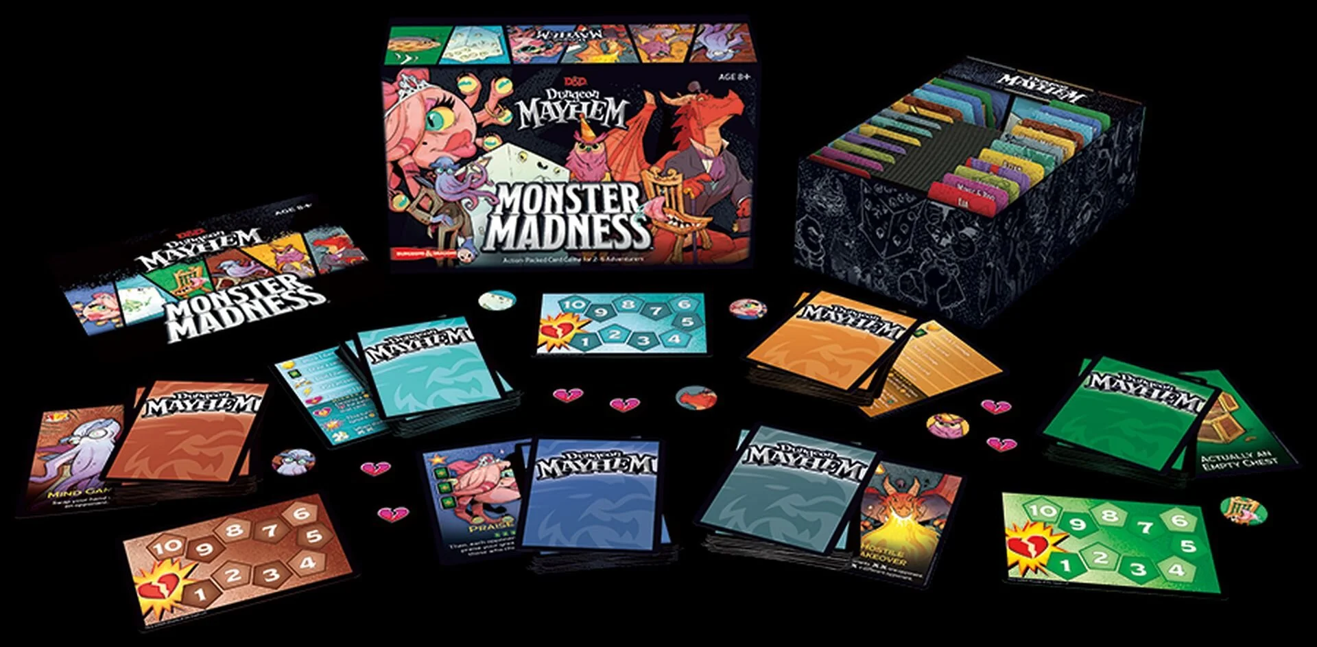 “In Dungeon Mayhem: Monster Madness, you play as one of six epic D&D monsters, each with their own way to charm, crush, disintegrate, and devour their foes. Pit these cunning creatures against any other Dungeon Mayhem deck, and store all your cards in this monster-sized box. Then select your favorite and prepare for mayhem. Plus, you can also enjoy bringing more adventurers into the fold with the addition of rules to include up to 6 players!”
