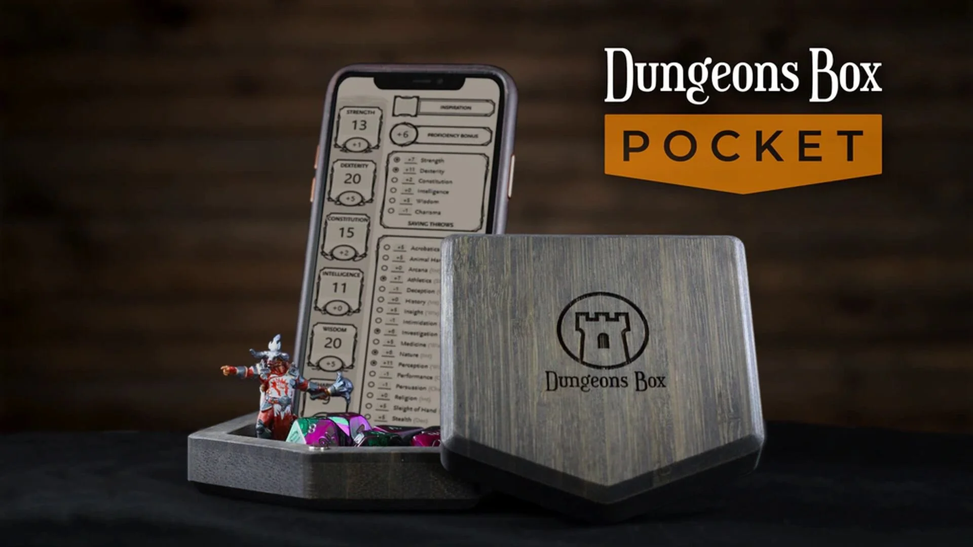 Well, now, Dungeons Box has launched a new Kickstarter campaign for Dungeons Box Pocket. This is a smaller version in a pentagonal shape that can hold your mini and dice in a smaller package to make mobile gaming smoother. The best part is that it’s designed so that you can set your phone in for anyone using a digital character sheet like D&D Beyond. These look absolutely killer and I’m very excited for them to ship out. My one concern is that since it’s smaller, you will have to be even more careful about how hard you throw your dice, but I’m sure it won’t be that bad.