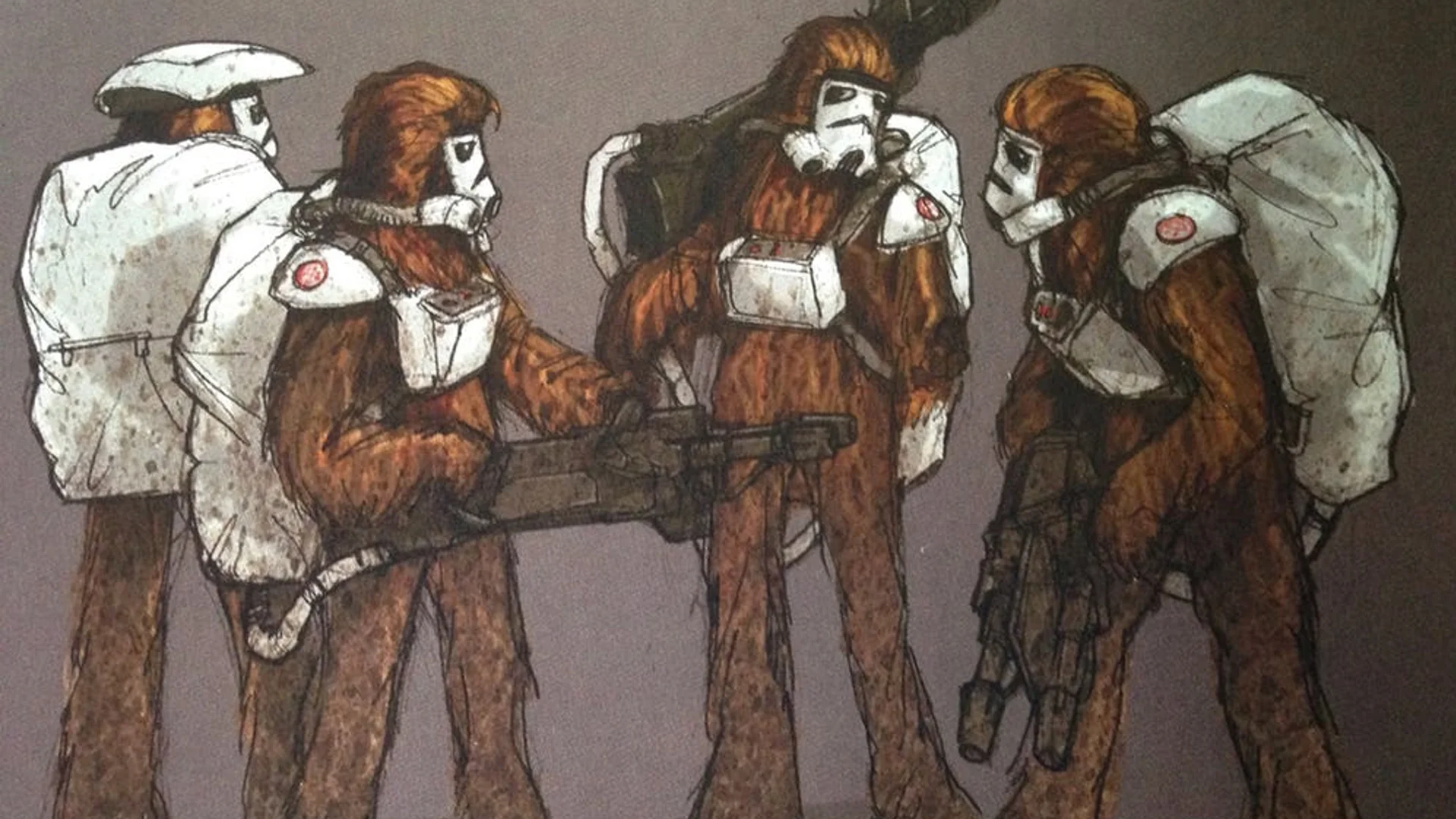 Turns out, we almost saw Wookiee Stormtroopers in Solo! In early drafts of the script, Wookiee slaves fought for the Empire, wearing stormtrooper armor into battle. They were specifically part of the Battle of Mimban. It's kind of a shame they never followed through with this concept because it's pretty cool!