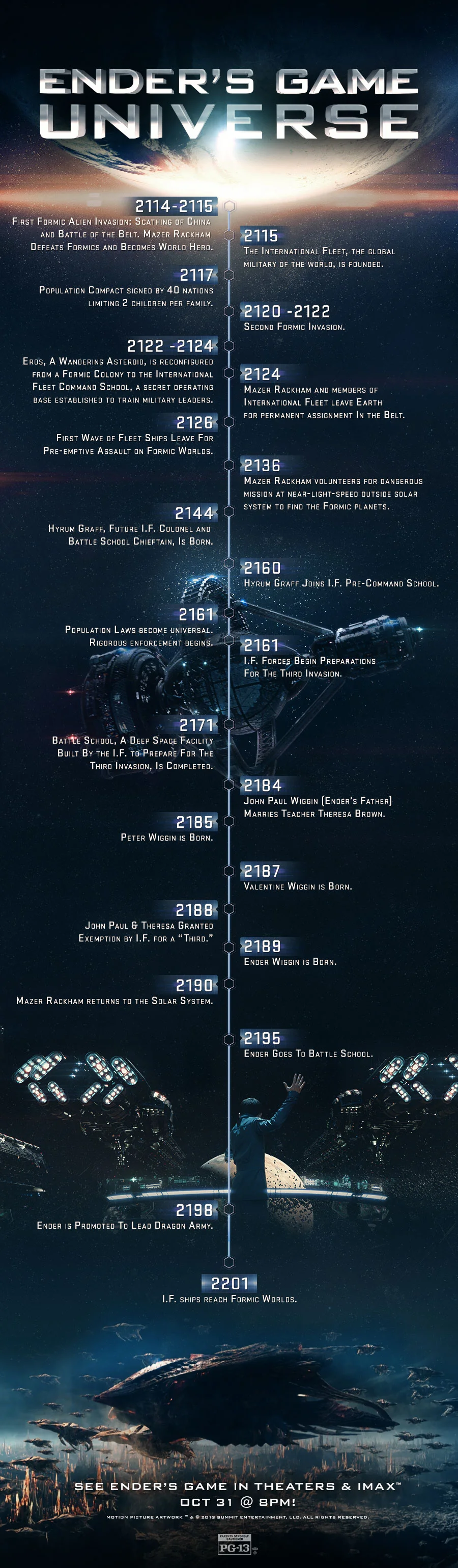 Summit Entertainment has released this infographic for their upcoming film Ender's Game. It gives us a chronological breakdown of notable events that take place in the epic sci-fi universe.