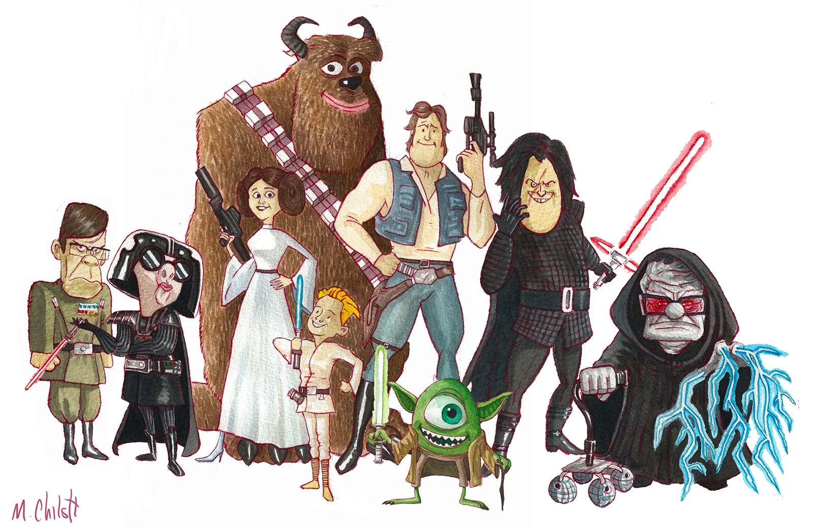I came across this incredibly fun Star Wars and Pixar mashup art called “Pixar Wars” and I had to share it with you! The art you see above was created by Mark Chilcott and it features Edna Mode as Darth Vader, Elastigirl as Princess Leia, Syndrome as Kylo Ren, Sully as Chewbacca, Carl as the Emperor, Mike as Yoda, Mr. Incredible as Han Solo, and Dash as Luke Skywalker.