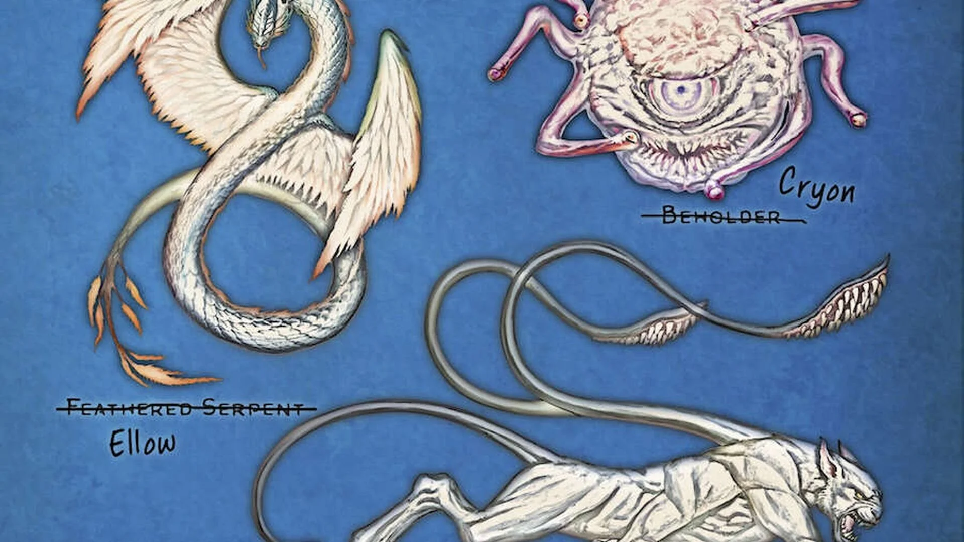 Introcaso showed his father, Lucian J. Introcaso, just the images of every creature in the Monster Manual and ask his father to name the creature, talk about how the creature behaved, and more. For instance, the Owlbear is now the Barowel. This is absolutely brilliant and a fun way to approach the project.