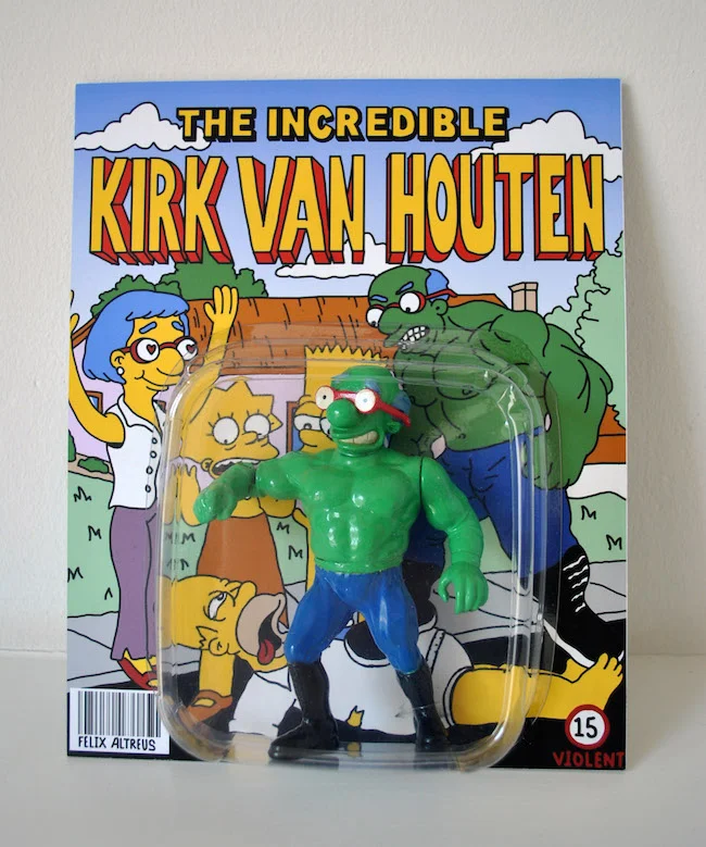 I've got a couple of hilarious custom-made action figures for your viewing enjoyment. We have E.T. Goes Pumping Iron and The Incredible Kirk Van Houten. They were created by Felix Altreus for the “Kill Your Shelf” bootleg toy show, which opens on Saturday, April 25th, 2015, from booth #39 at the Toyconuk. Not only are the figures themselves awesome, but the illustrations on the back of the packaging are funny as hell.