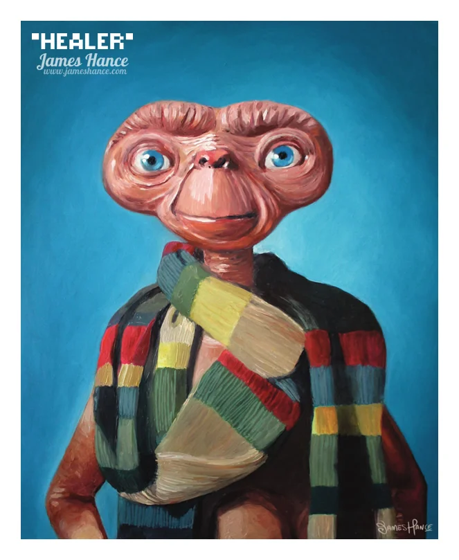 Artist James Hance has created this wonderfully fun E.T. inspired Doctor Who oil illustration called 'Healer.' This isn't the first piece we've featured from the artist. He's done a lot really cool stuff like his Wookie the Chew series. You can see a lot more of his art here.