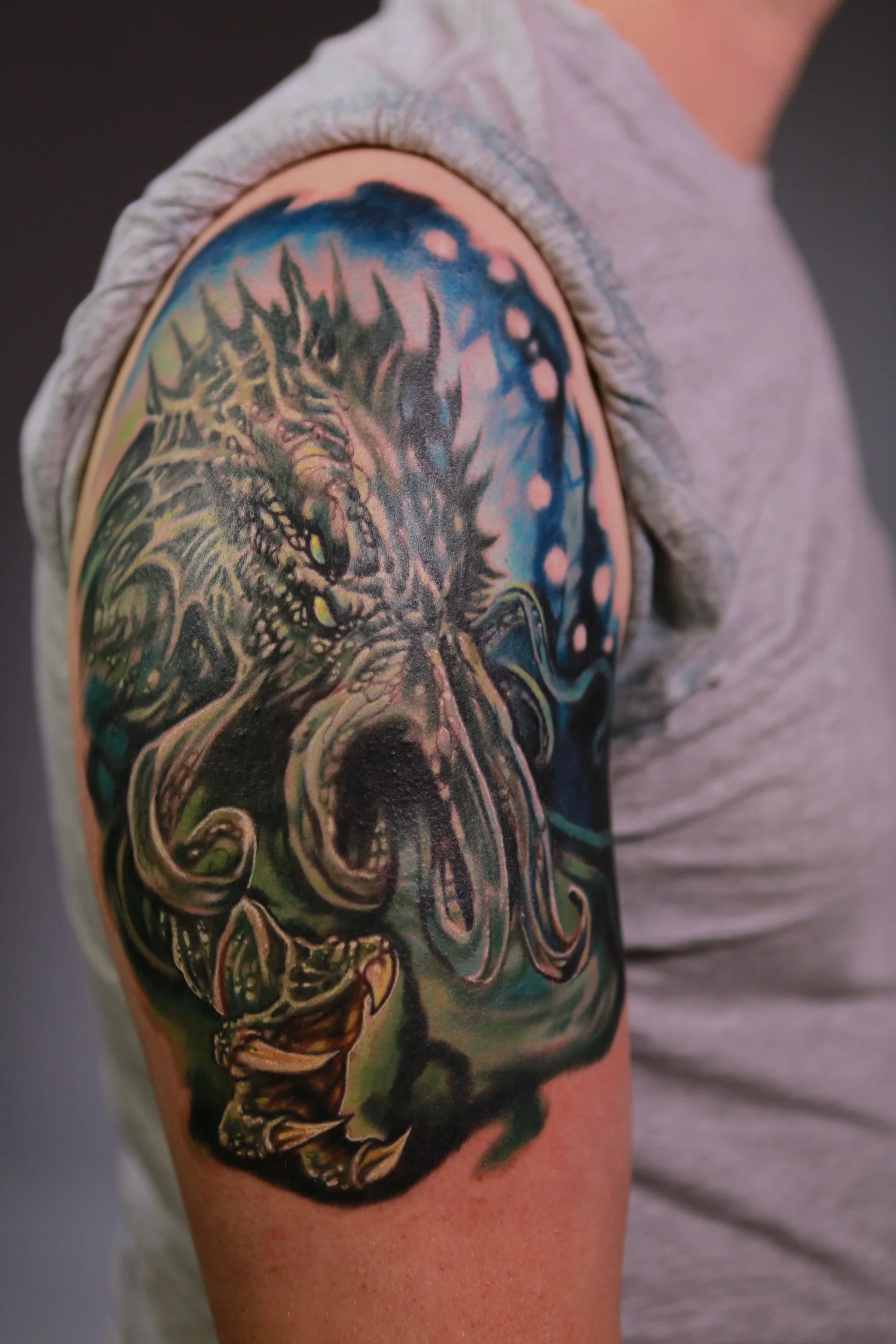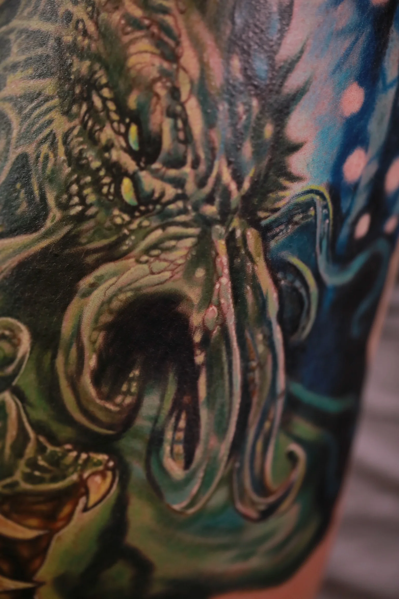 “I wanted to capture the horror aspect of H.P Lovecraft's Cthulhu but I also felt there's a sci-fi element to the creature as well so I opted for brighter tones than you'd typically expect from a 'horror' tattoo. I wanted to also give it the illusion of scale within his environment so I added more fine details to the foreground and allowed the image to appear 'softer' towards the background to give it depth of field. I had a lot of freedom from the client and a lot of freedom on the design since Cthulhu's image is left up to the reader's imagination. Overall it took me about 6.5 hours and I'm stoked on the final result!”