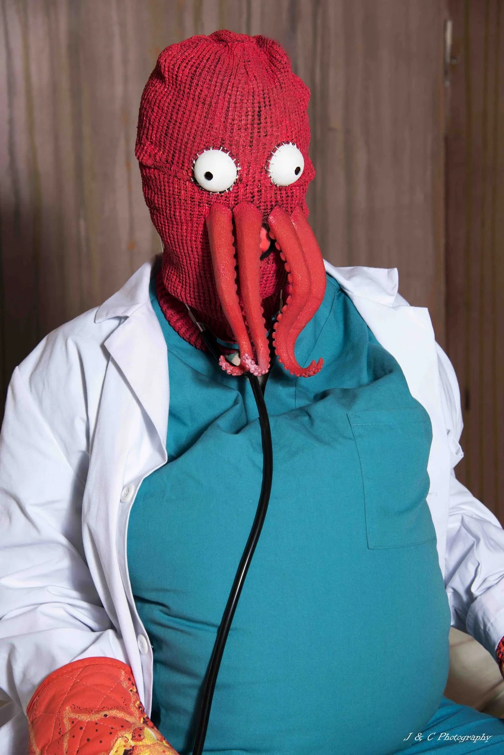 "Futurama is my favorite TV show ever (Got a Bender and Robot Devil tattoo), but I could never figure out what character to cosplay from the show. Most of the outfit designs are kind of boring or don't translate very well to real life, I think. Zoidberg is one of my favorite characters so I decided to do this for Halloween. I specifically wanted to make it look campy, cartoony and kind of homemade, something people could conceivably make on their own. The mask is a ski mask with finger tentacles sewn on, and ping pong balls cut in half, drilled and sewn on for eyes. The claws are oven mitts and the rest of the outfit was put together with Goodwill finds. Lots of fun to make and wear, although eyesight is limited in it XD It was photographed at a group shoot event which is why each photo has a different photographer."