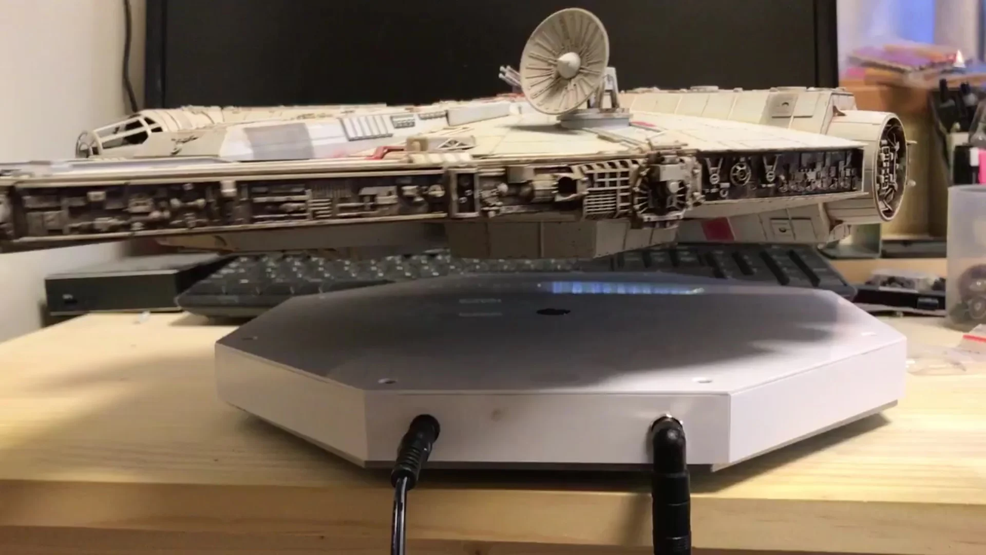 ミレニアムファルコン完成です。CREALEV社製の70mm浮く磁気浮上装置使って浮遊させ、エンジンは無線給電で発光します。装置の日本代理店である㈱ワイアードゲートさまとのコラボレーションで製作しました。二子玉川蔦屋家電で展示中です。#ローグワン #スターウォーズ #蔦屋家電 pic.twitter.com/egdv99zreT