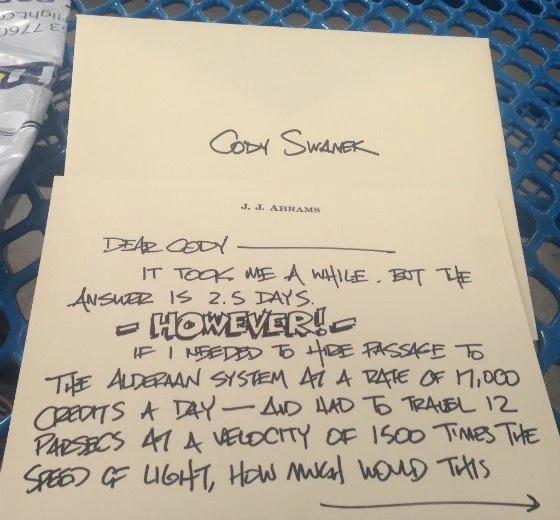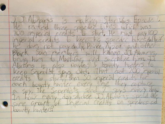 A 13-year-old by the name of Cody was recently given an assignment for school to write an algebraic expression into a word problem. He used all of his Star Wars fandom and knowledge to write a word problem that is flooded with Star Wars references. The coolest thing about it is that J.J. Abrams saw it, solved the problem, and sent it to Cody with a question of his own. I think what impresses me the most is that the kid really knows his Shadows of the Empire characters. Here's the math problem:
