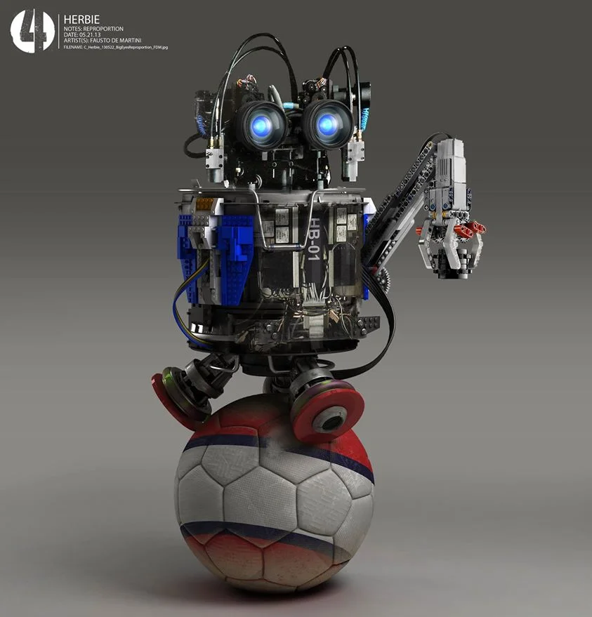 Thanks to concept artist Fausto De Martini (RoboCop, Transformers: Age of Extinction) we have some concept designs showing us what HERBIE would have looked like. And well, he looks like a robot sitting on top of a soccer ball. That little soccer ball look is reminiscent of BB-8 from Star Wars: The Force Awakens, but this has a completely different look.