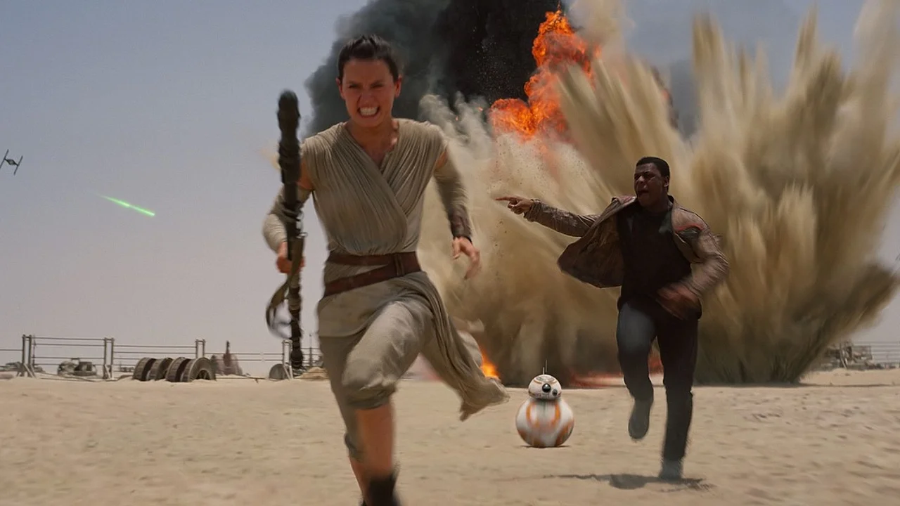 We've seen a few trailers and a bunch of TV spots for Star Wars: The Force Awakens, but today we bring you the first film clip. It's a brief, exciting clip that features some explosive footage of Finn, Rey, and BB-8 trying escape a squadron of First Order TIE Fighters. Things really aren't going well for them.