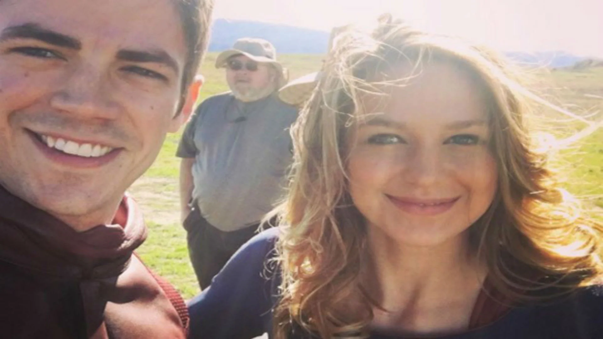 Even though producers are trying to reveal as few details as possible, Grant Gustin obviously lacks the ability to be secretive. So on his Instagram page he shared the first photo of him and Melissa Benoist, both wearing their superhero costumes. Barry Allen and Kara can be seen on set, while shooting “World Finest” — Supergirl’s eighteenth episode.