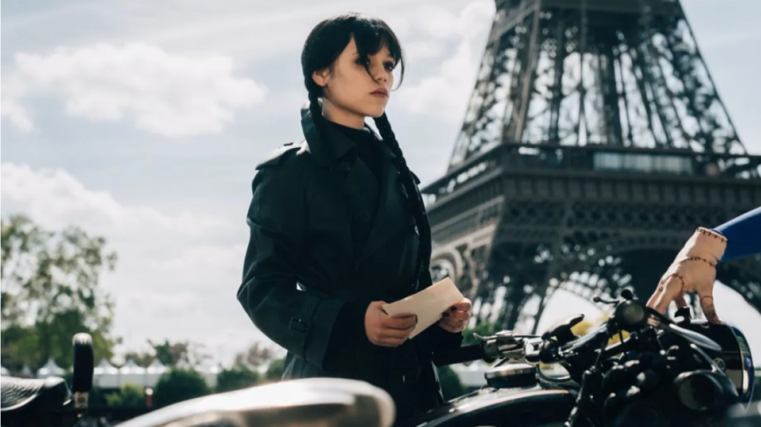 Netflix has released a photo from season 3 of their hit drama Wednesday. The photo features the title character, played by Jenna Ortega, who is on an expedition to find her friend, standing in front of the Eiffel Tower in Paris, France, beside a motorcycle.