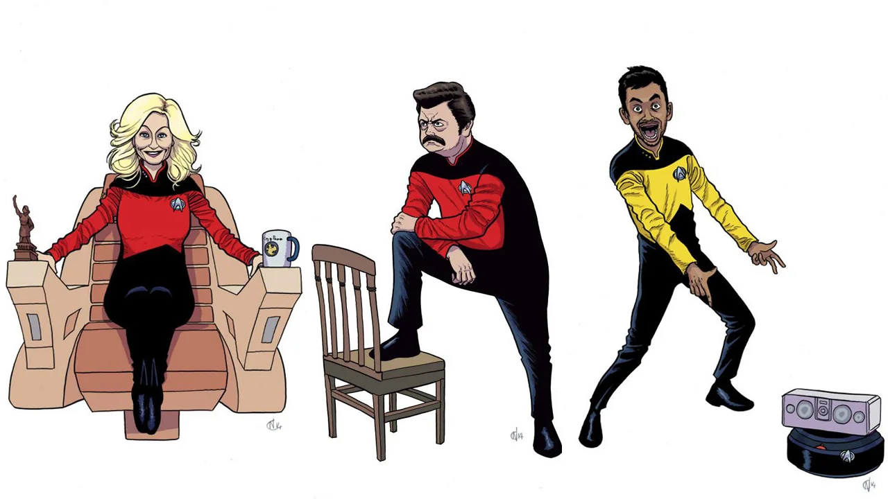 Parks and Recreation is one of my favorite shows of all time, so I always get a kick out of weird mash-ups or bizarre fan art featuring Leslie Knope, Ron Swanson, and the rest of the Pawnee gang. Parks and Trek is a series of art pieces by comic artist Neill Cameron that imagines the characters of Parks on board the Enterprise from Star Trek. Most of these are pretty cool, but I think the one of Chris Pratt's Andy Dwyer looks more like Beavis than Andy. Which one is your favorite?