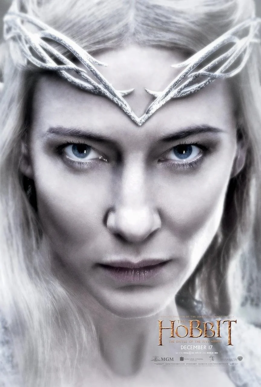 The latest character poster for Peter Jackson's The Hobbit: The Battle of the Five Armies features Lady of Lothlórien herself, Galadriel, who, as you know, is played by the beautiful Cate Blanchett. She was such a perfect casting choice for this character. She has a very intense look in this poster, and you could seriously just get lost in those eyes of hers. We have previously shared posters featuring Gandalf and Bilbo, and you can expect to see more.