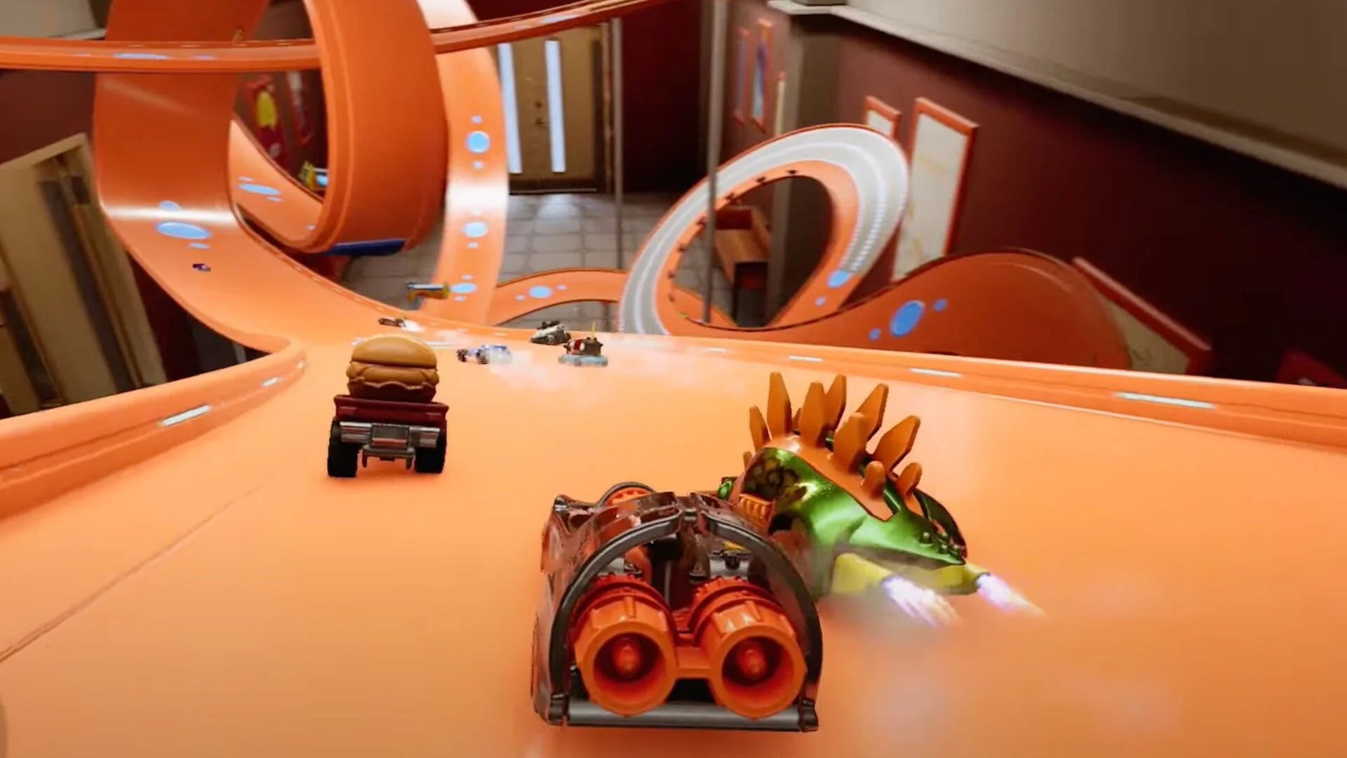 The course features a main hallway and three rooms (the library, the classroom, and the chemistry lab) that players can use to create tracks. You can also utilize the ventilation shaft. In addition, the latest trailer shows off six more of the 60+ cars that players will get to race: Street Wiener, Total Disposal, Power Rocket, Skull Crusher, Tanknator, Winning Formula, and Exotique.