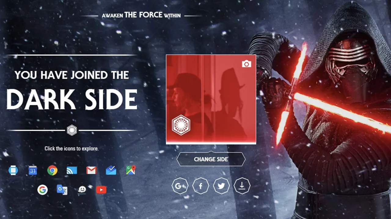 The Force seems to be awakening everywhere as the Star Wars hype keeps growing. This time around, Google pays tribute to the epic series and invites all fans of the saga to show their allegiance and choose a side. Ahead of the premiere of the seventh movie, the search giant gives fans a Star Wars themed portal which not only asks for you to choose either the Light or the Dark Side but it also transforms your experience when using Google applications.