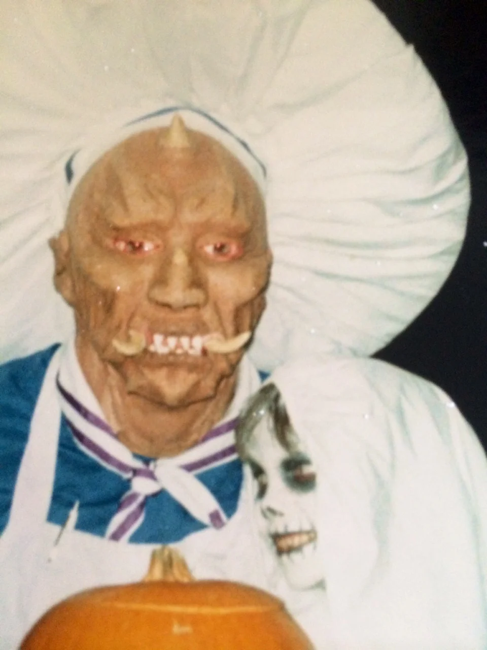 My dad was taking a special effects make-up class in college at the time, and he had created this terrifying mask as one of his projects. It had a bald head with horns, sharp teeth, and bloodshot eyes. This thing was scary as hell. That's a real picture of it above.
