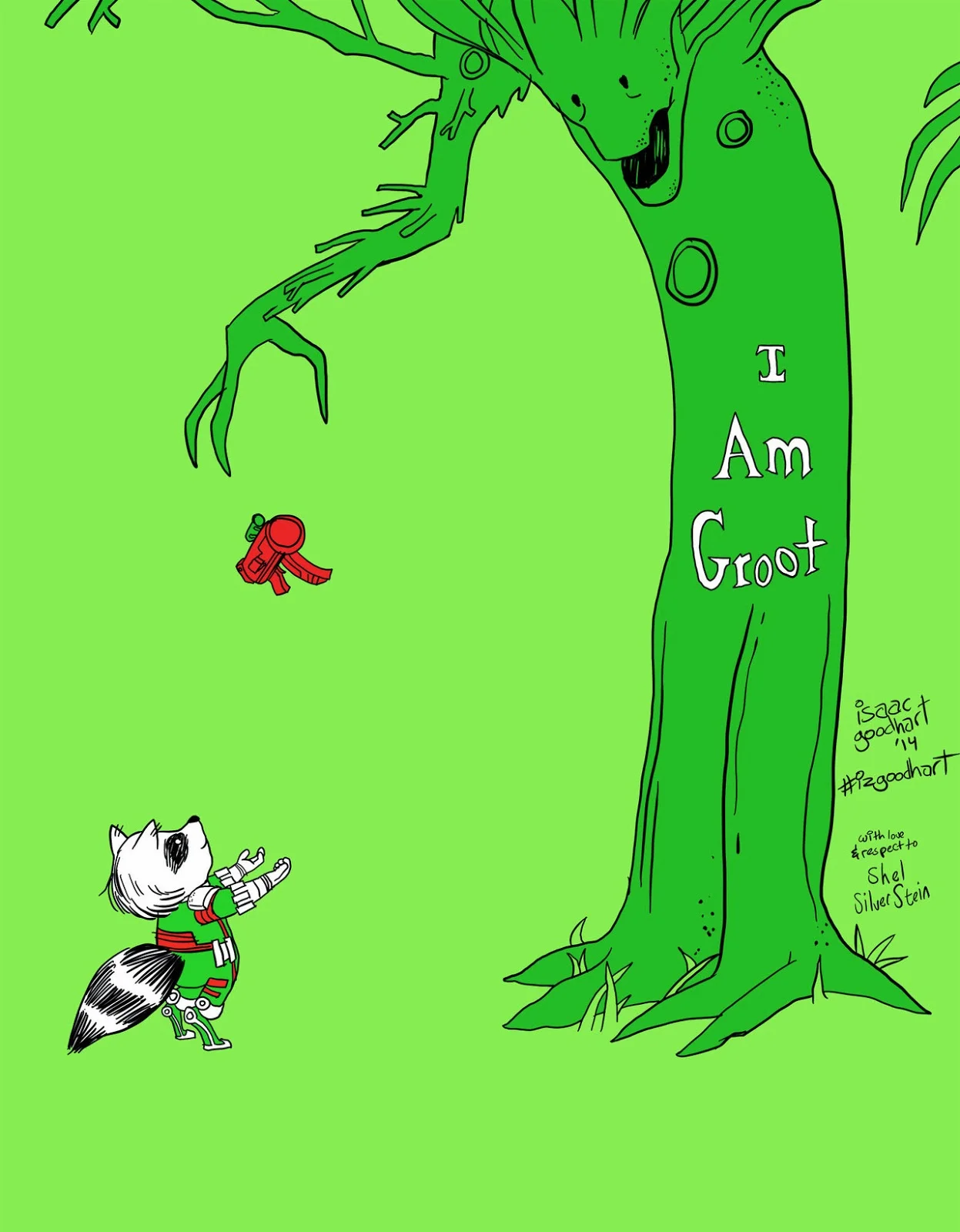 I just so happen to have a copy of The Giving Tree within reaching distance of my laptop. I also have the trailer for Guardians of the Galaxy saved on my desktop. Those two facts probably clue you in to how much I love this mashup illustration from by Isaac Goodart. The piece is titled “The Giving Groot,” and it puts a nice Marvel twist on Shel Silvertstein’s classic children’s book. (via: Neatorama)