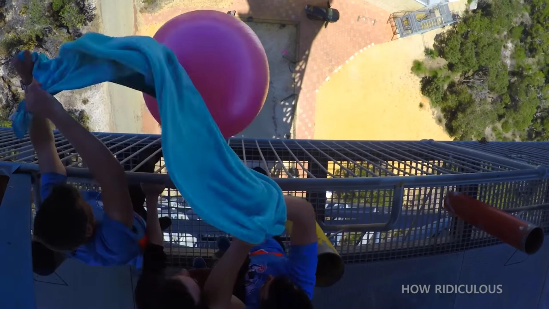 I'm sure you know full well how this video is going to end, but don't you want to see it anyway? The group How Ridiculous took an exercise ball full of water and threw it from a tower and, big surprise, it blew up like a water balloon. If you're wanting to skip the ridiculous amount of time it takes to explain this simple task (I highly suggest you do) go ahead and start it at the 1:45 mark to see the final effect and replays and all that garbage.