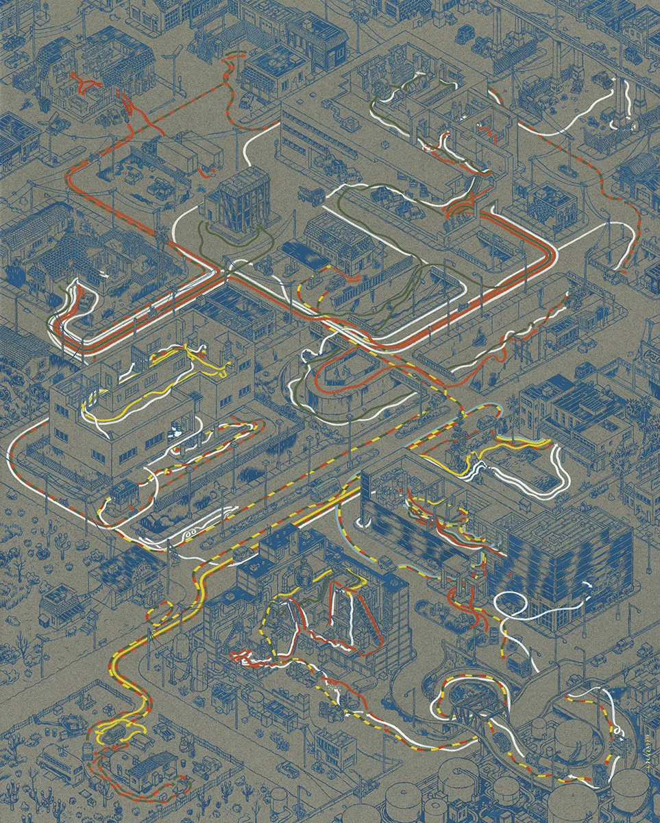 If you're not familiar with the art the colored lines represent different characters, which is why some of the colors break off into different directions.