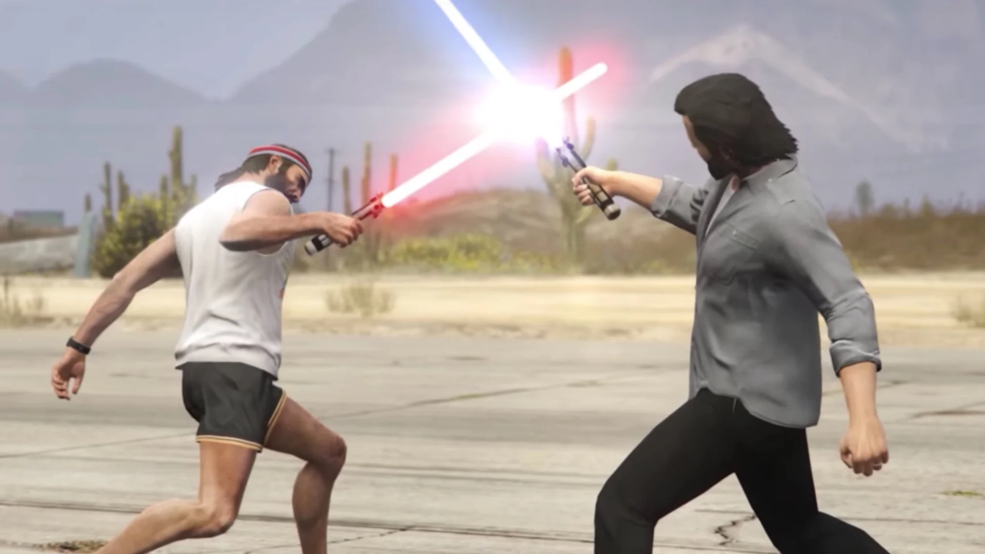 Darth Trevor and Michael Kenobi put their force powers to the test in this incredibly entertaining Star Wars lightsaber battle that was created using Grand Theft Auto V footage and After Effects. The video comes from Boris the Blade, who explains: