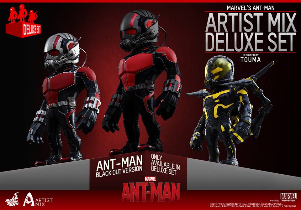 Hot Toys is mostly known for designing ultra-realistic collectible action figures for the awesome genre films that we love so much. They have branched out into other avenues though with their Artist Mix Figures, which offers fans a different stylized design. They are created by by the Japanese toy artist Touma, and these are the Ant-Man figures! They include Ant-Man, Yellowjacket and Black-Out version, which might end up being a big surprise in the movie.