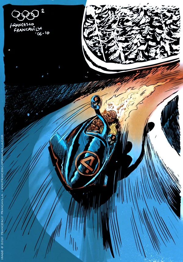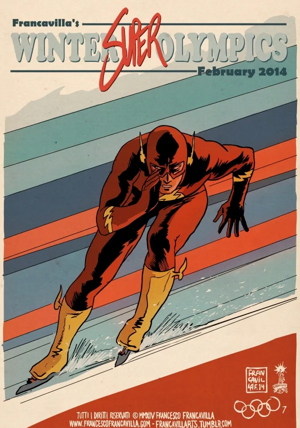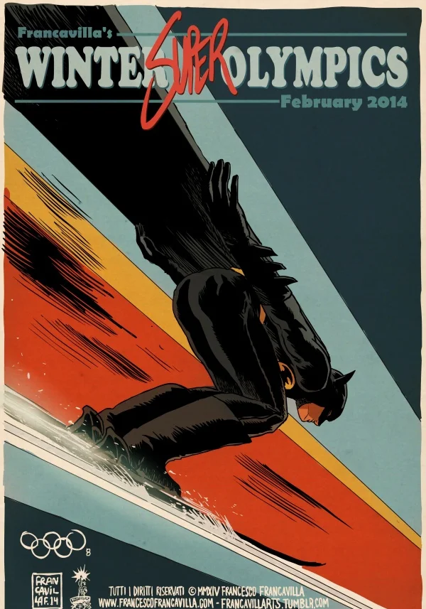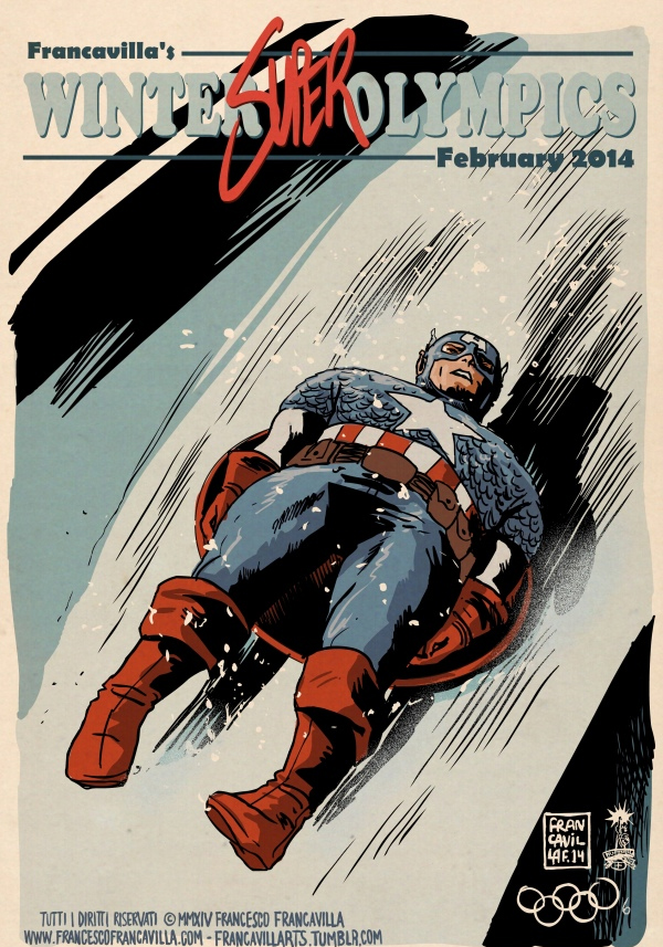 We’ve long been fans of artist Francesco Francavilla. We have featured a wide array of his work, from his Hellboy/Peanuts mashups, to his grindhouse style take on Batman, to the many Mondo posters he has done over the years. We now present you with a timely series he created called “Winter Super Olympics,” which features superheroes competing in The Winter Olympic Games. Of course, these heroes would have an unfair advantage over the competition. But hey, they’re all representing team U.S.A., so that’s cool, right? Wait! Wolverine, are you playing for Canada, you jerk?!