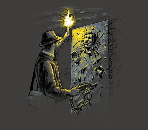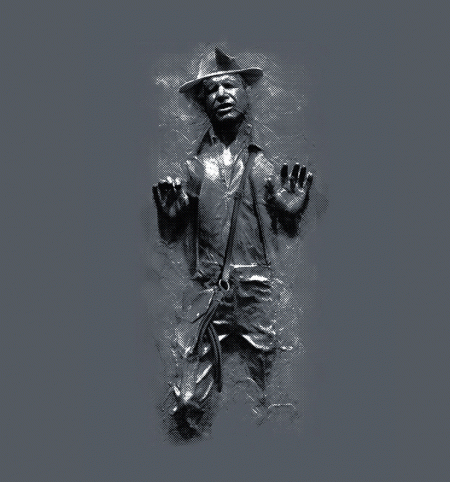 This Star Wars and Indiana Jones mashup graphic awesomely features Harrison Ford’s Indidna Jones trapped in carbonate! I’m surprised I haven’t seen anything like this created sooner. This is a t-shirt design called "Carbonite Jones." It's available for purchase at Busted Tees, and it came with the following caption: