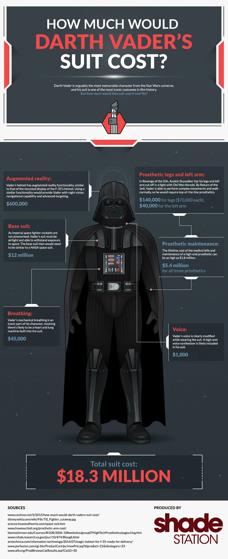 Shade Station released an infographic that breaks down the cost of Darth Vader’s suit based on certain technologies that actually exist in our world. The total amount is $18.3 million, and you can see how they came up with that cost below. Vader must have some of the best medical insurance in the galaxy.