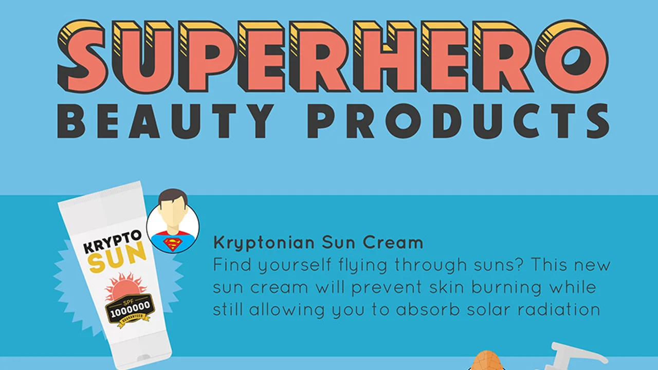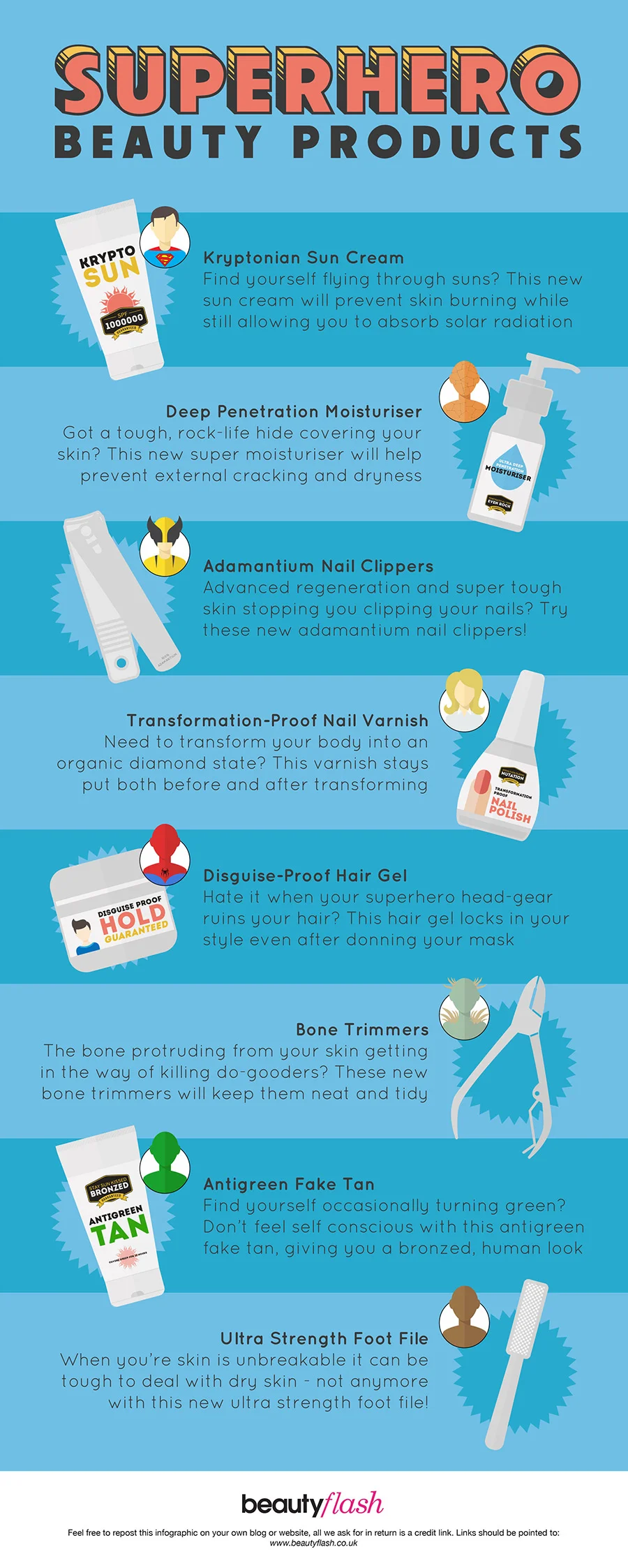 The people over at BeautyFlash have created an infographic of beauty products designed specifically for superheroes, and some of the products are pretty funny. Take a look below, and be sure to click here if you're interested in checking out some more infographics.