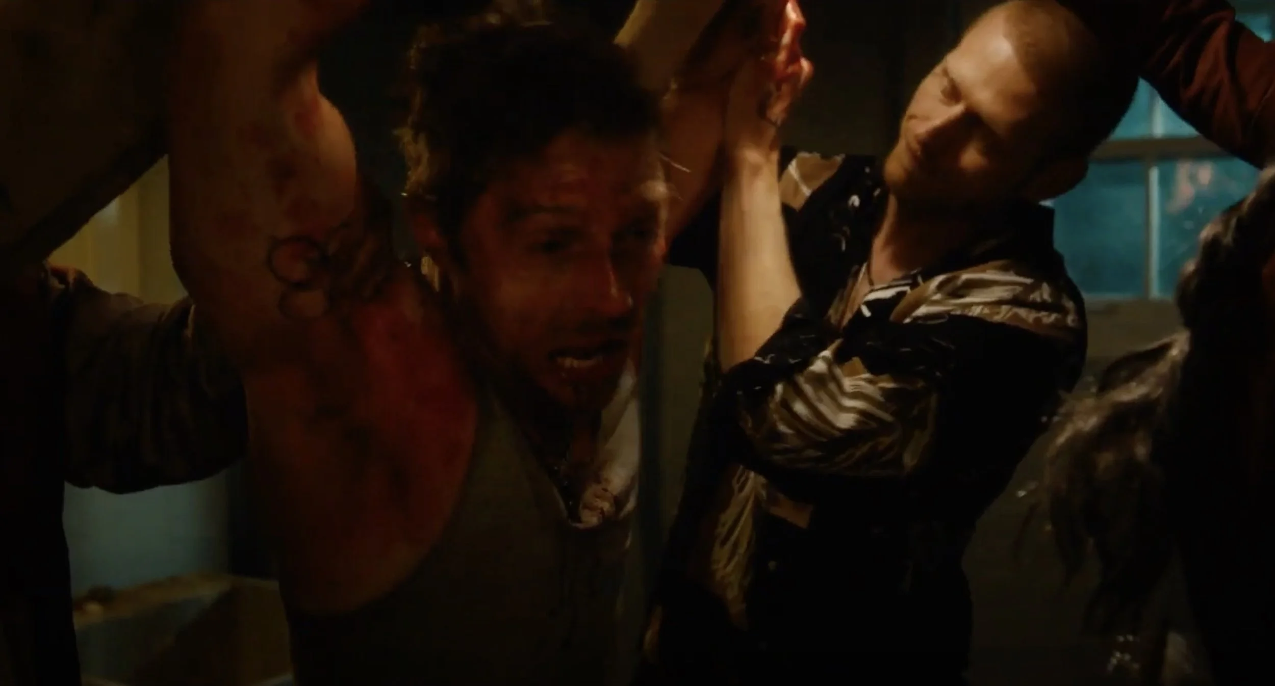The clip features MacDowell brutally interrogating some poor bastard who’s been beaten pretty badly.