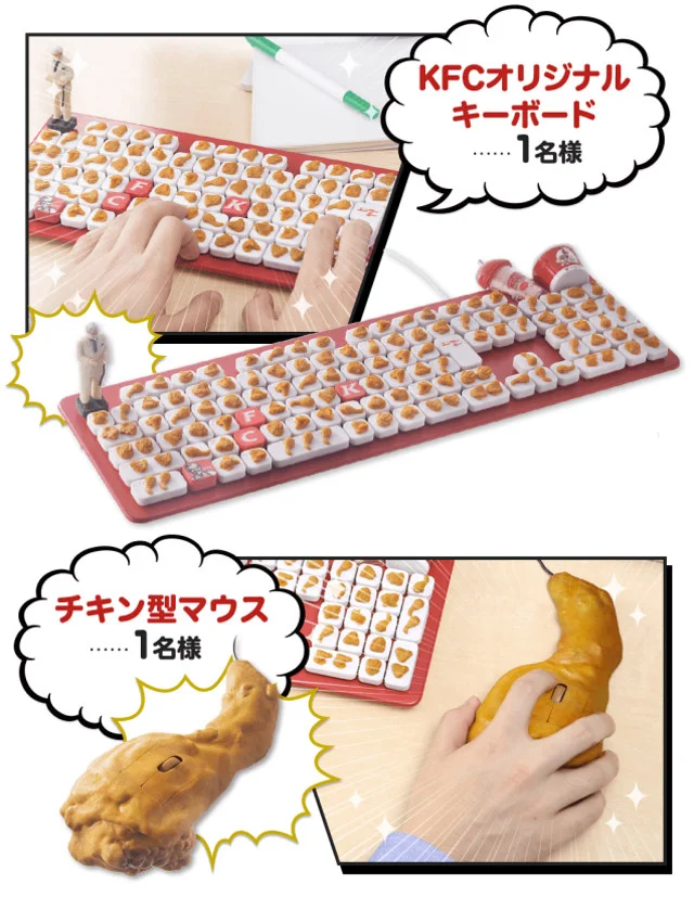 The world has been begging for a Kentucky Fried Chicken keyboard and mouse, and I'm proud to announce that it's finally here! The keyboard and mouse were created by KFC in Japan for some kind of social media promotion, so they aren't available for purchase. That thing looks like it would be ridiculously hard to use! I love that K, F, and C are the only actual letters on the keyboard, and it's so awesome that Japan comes up with crazy stuff like this! There's even a fried chicken leg USB stick. Thanks to Kotaku for the tip!