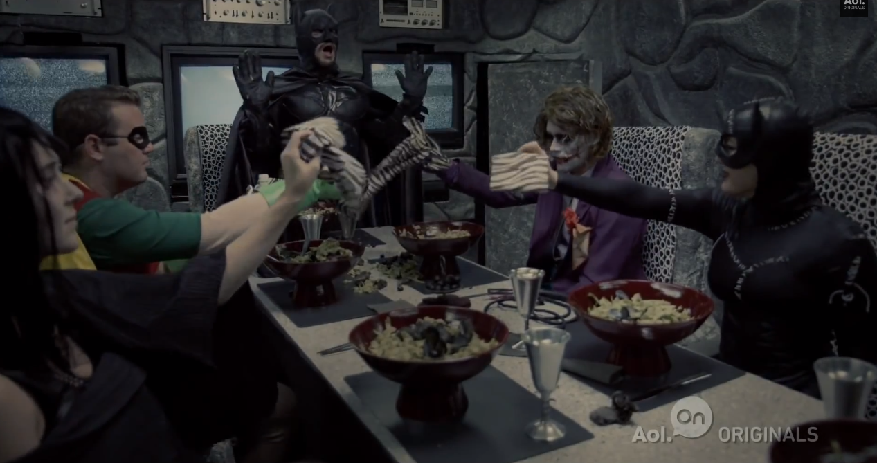 James Franco teamed up with AOL to develop a web series called Making A Scene. They have a "Wheel O' Movie Scenes" that determines what the mash-up scene they shoot will involve. In the latest episode, the spin brings together the Banana Boat dinner scene from Tim Burton's Beetlejuice and the Joker "make a pencil disappear" scene from Christopher Nolan's The Dark Knight. The video turned out to be really entertaining. I thought it was funny that Franco has obviously never seen Beetlejuice because he needs to have that scene explained to him. How does a person go through this world and not see Beetlejuice?! Especially someone like Franco. The sketch is called "Batjuice," and the scene they create includes Batman, the Joker, Catwoman, Beetlejuice, Lydia, and Robin at a dinner party that eventually goes into lip-synching to "Day-O (The Banana Boat Song)."