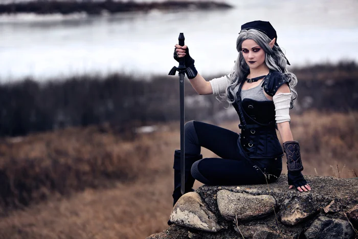 This Legend of Zelda Shadow Link cosplay by Jessica Huard of ESKJ Shoes & Art is really well made. Add to that the great work done on the makeup for the ears, the black sword, dark shield, silver wig, and red eye contacts, and we get some epic cosplay. The photos by Maegan Towes turned out really well, making great use of the wintry location.