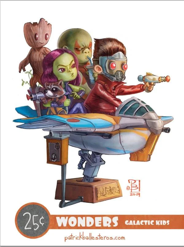 Check out this amusing art by Patrick Ballesteros featuring several child versions of pop culture characters from movies and TV riding those little quarter machine rides for kids. The series is called Lil' Wonders, and it features The Guardians of the Galaxy, The Neverending Story, Ghostbusters, Aliens, Firefly, Batman, Star Wars, The Karate Kid, and more. Thanks to XombieDirge for the tip!