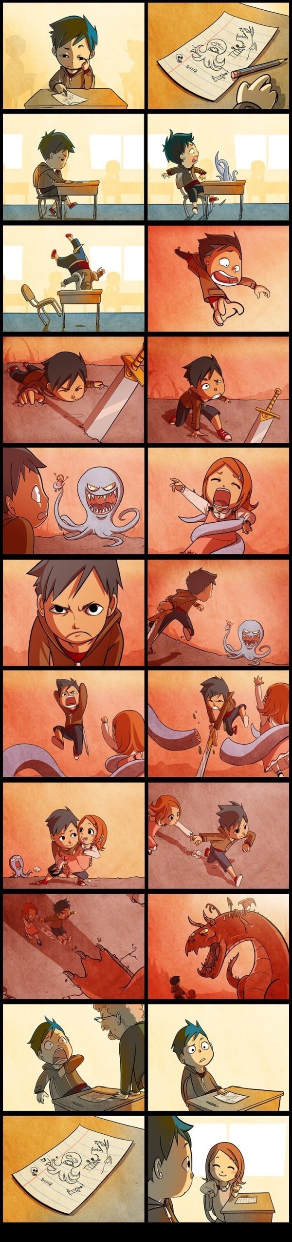 I’ve got a wonderful comic strip here created by Patrick Quach called Little Hero. It tells the story of a young boy who, bored in school, gets sucked into his imagination where he embarks on an adventure to save a girl from a villainous octopus-like creature. It's a wonderfully charming story. I enjoy stories that dive into the imagination of children because that’s the kind of kid I was growing up — I would get lost in my imagination, and these kinds of stories bring back some of those nostalgic memories. I'd love to see someone animate this and bring it to life.