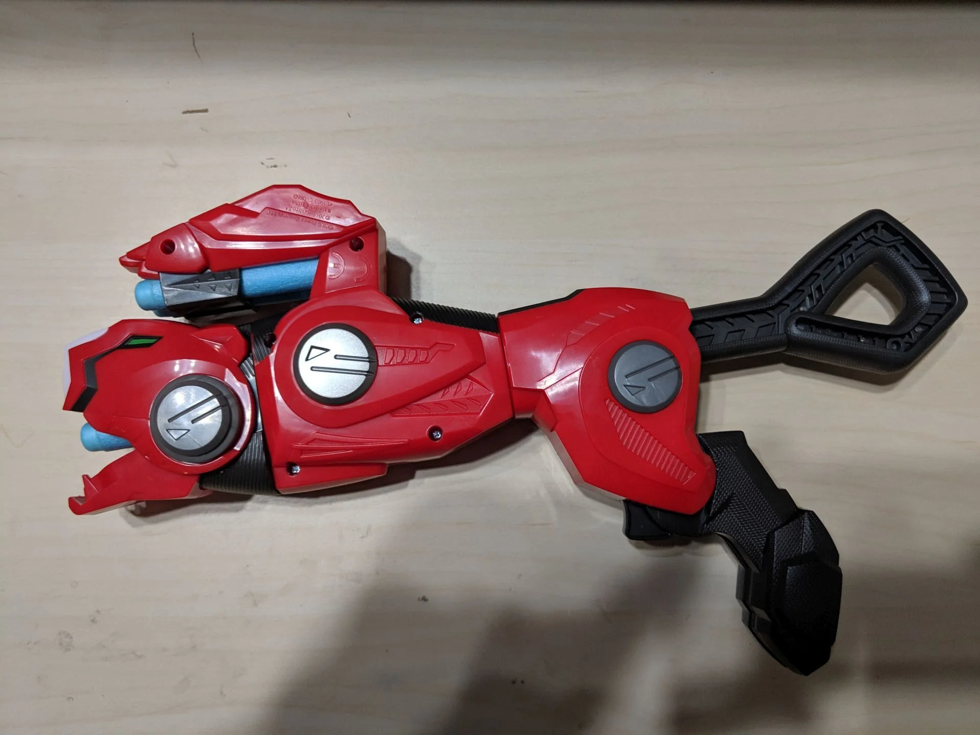 This is a NERF gun. It looks like a Power Rangers toy and is NERF. NERF make good quality products. This is no exception. I do have one problem though. The handle is a little small for an adult. I found that to have a comfortable grip meant that I was pulling the trigger with my middle finger. Other than though, it’s great! It has some power behind it and when you pull the tail back, the mouth opens and the middle section rotates for a cool design.