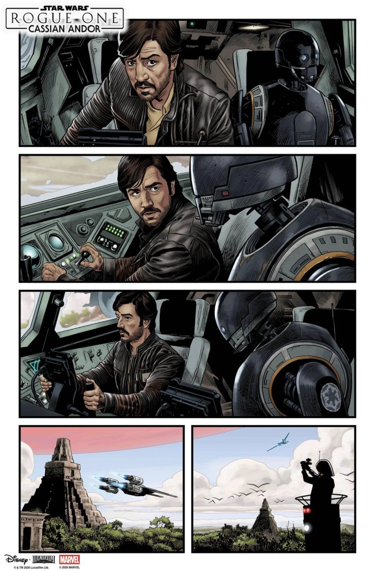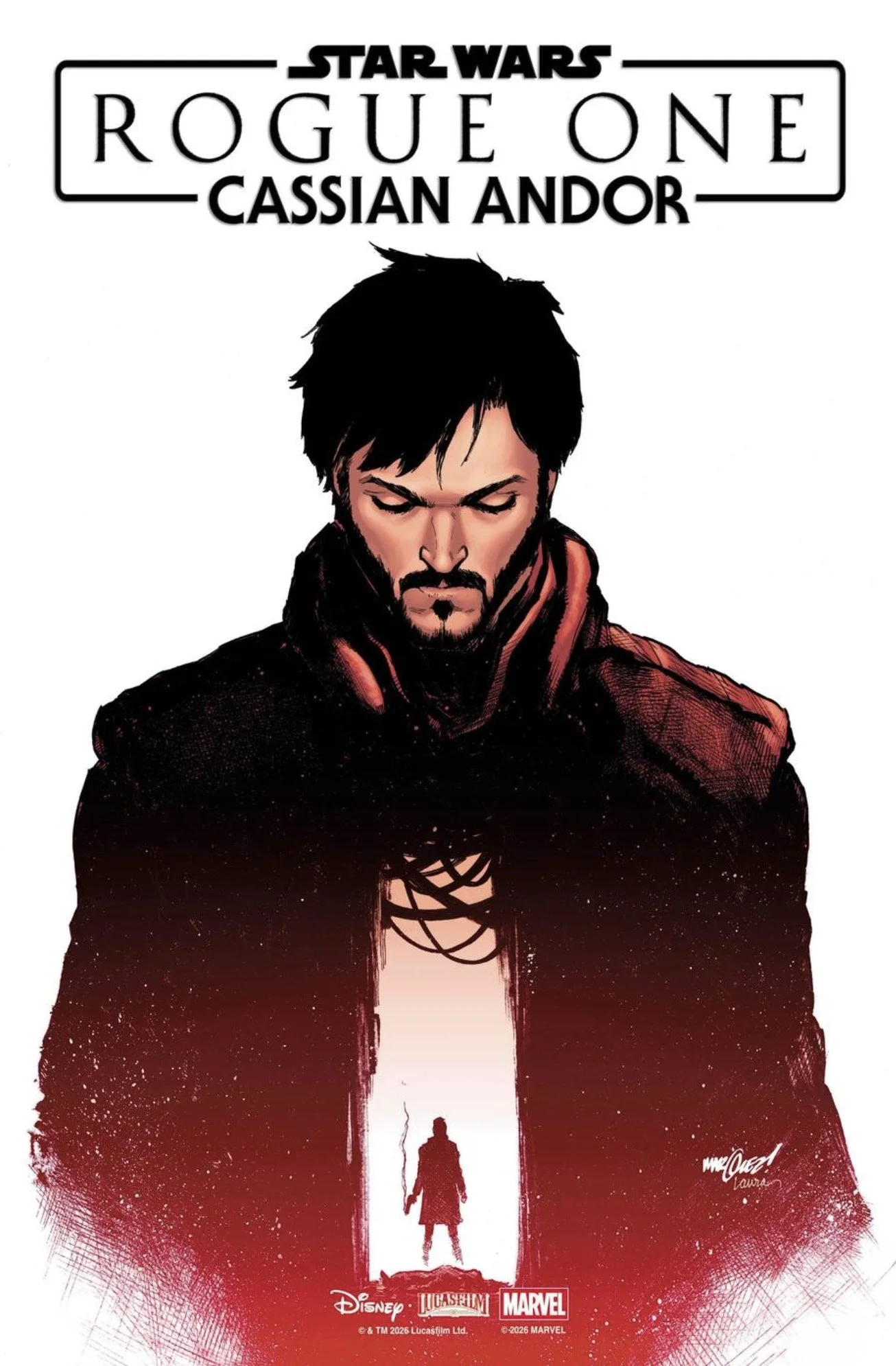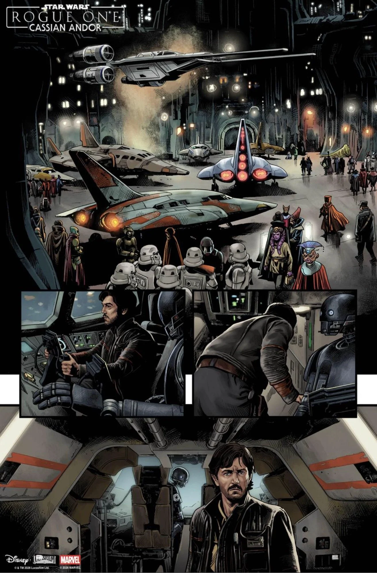 We’ve now got a first look at the covers by David Marquez along with preview pages from Star Wars: Rogue One – Cassian Andor #1, written by Benjamin Percy with art by Luke Ross. The issue lands in comic shops on May 6, and it’s already shaping up to revisit one of the most talked-about moments in the film.