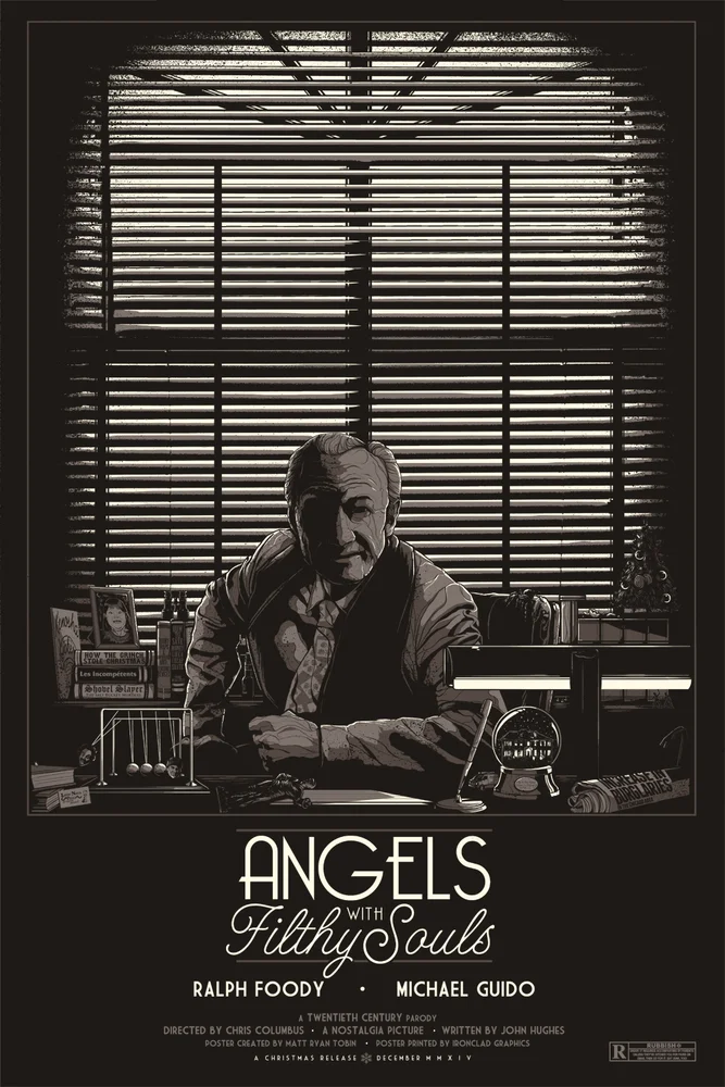 “When approaching a concept for Home Alone, we knew the interior of the McCallister home and all of Kevin’s tricks to foil the Wet Bandits were likely to be the focus of our design. However, we also wanted to incorporate the exterior of the house and provide a different perspective on some of the movie’s most iconic scenes. We took some liberties with the architecture of the house and the layout of the property, but in the end the exterior allowed us to include some of our favorite imagery from Home Alone including the Oh-Kay Plumbing van, the perpetually knocked over bronze statue, and off course, Old Man Marley. This poster was an interesting challenge for us as we’ve typically been using two-color printing for this more realistic style. This time around, we stepped up to a four-color design that looks great with the fine halftones blending the colors. The poster is printed on a subtle metallic paper that will give the snow an extra shimmer as well.”