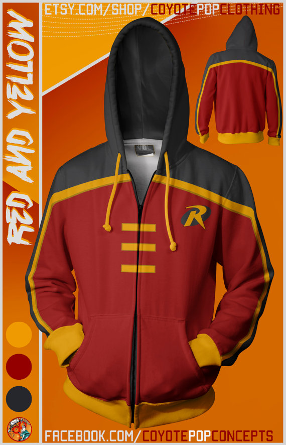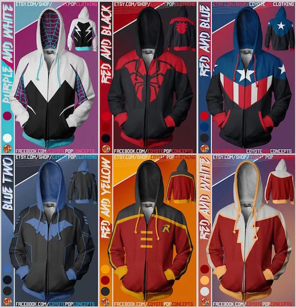Check out this amazingly radical set of superhero hoodies from Coyote Pop. Each one comes in a badass style representing the likes of Spider-Man, Captain America, Robin, Nightwing, and more. These are some of the coolest superhero hoodies that I've seen. They're definitely a lot better than the stuff that you would find at Hot Topic.