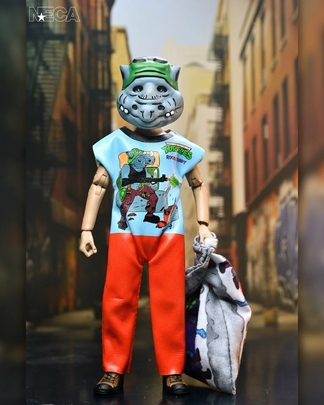 “Featuring faithful recreations of the original Collegeville costumes, this wave includes all four heroes in a half shell, Leonardo, Donatello, Raphael, and Michelangelo, plus classic villains Shredder, Bebop, and Rocksteady. Each 6-inch costumed action figure wears a mask and soft goods clothing replicating the signature vinyl look of the classic costumes and includes a soft goods trick-or-treat pillowcase accessory.