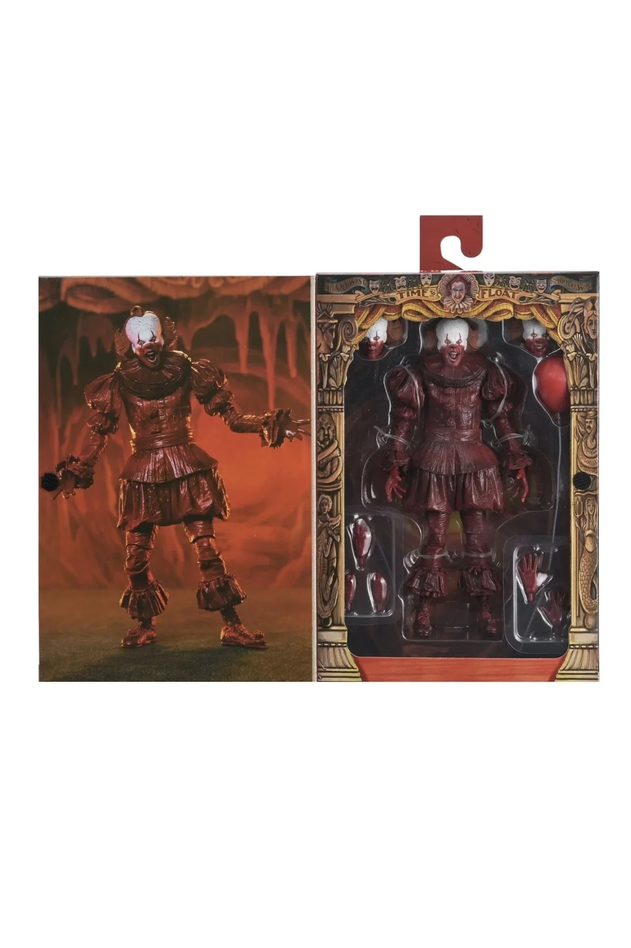 “Standing in 7-inch scale, Pennywise features gruesome, blood-soaked deco and interchangeable heads and hands. Comes in collector-friendly window box packaging with opening front flap.”