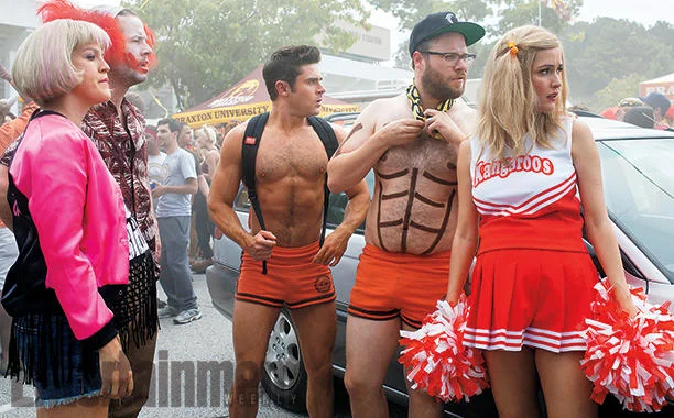 Universal Pictures has released the first pic from Neighbors 2, which sees Zac Efron and Seth Rogen suited up in short shorts while Rose Byrne is decked out in a cheerleader costume. Considering the fact that Chloe Grace Moretz and Selena Gomez joined the movie as sorority sisters, the new film will be about the stars from the first film joining forces to take down the sorority. That one hits theaters on May 20th, 2016.