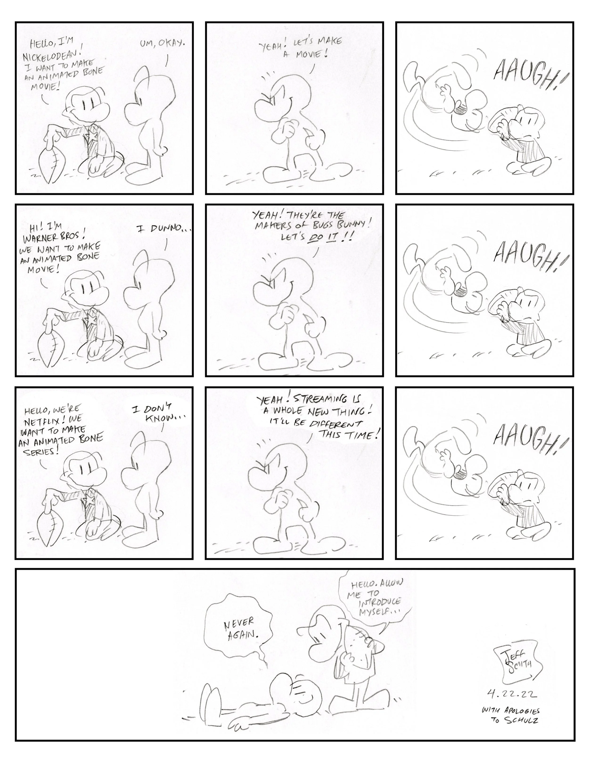 Well, now Netflix has canceled its attempt to adapt Bone. The project was one of the casualties of Netflix’s current issues as they are restructuring their animation division. This is pretty disappointing news because Netflix was supposed to be the best shot at getting the series made. Now Smith is expressing his frustration on the matter in a comic strip he recently posted on social media. You can check that out below: