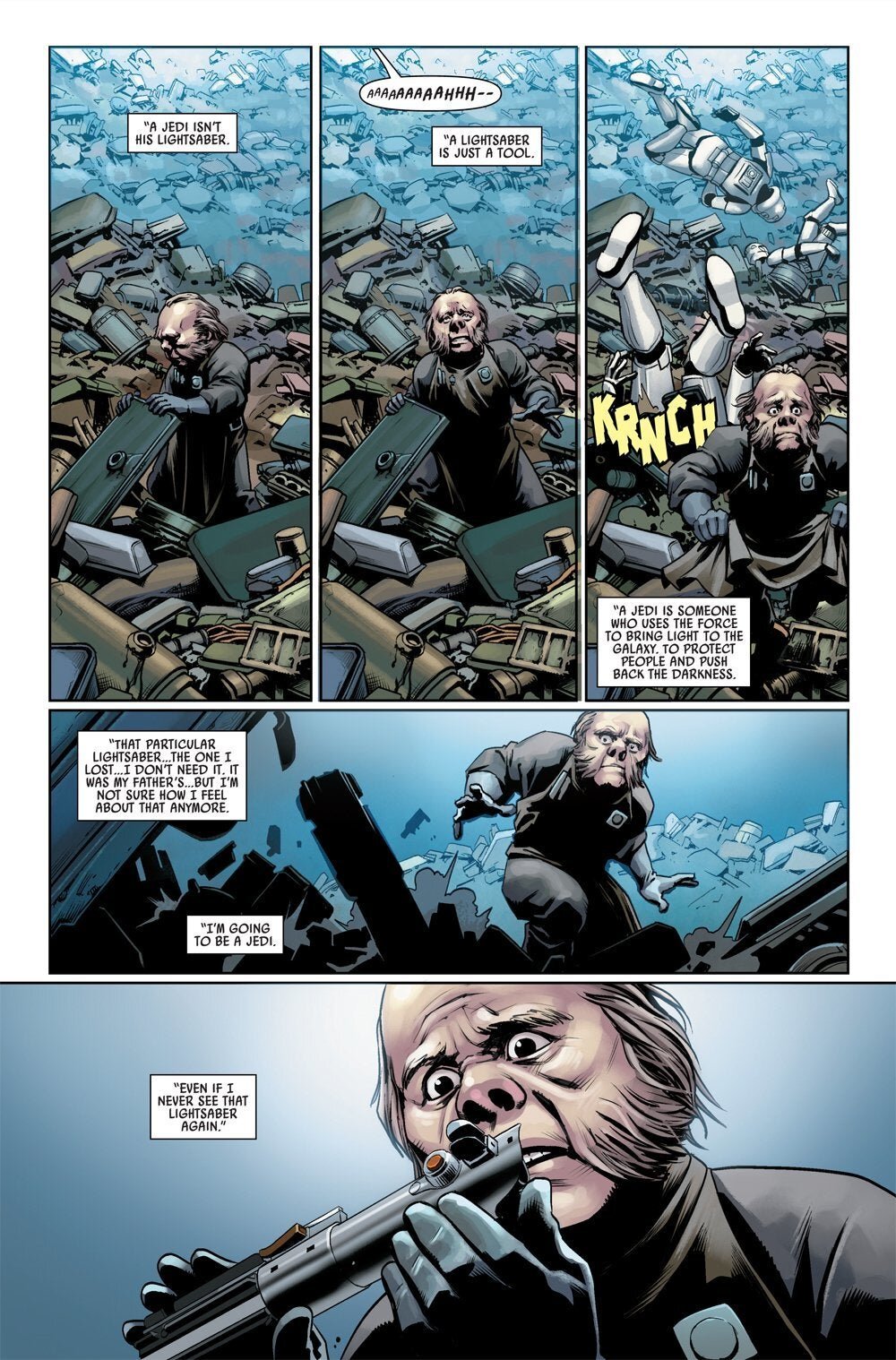 In this most recent issue, Luke is struggling to find his lightsaber, but he ends up abandoning his search for it after he sensed that his friends were in trouble, so he went out to rescue them. It’s here that he realizes that being a Jedi is definitely much more than his lightsaber.