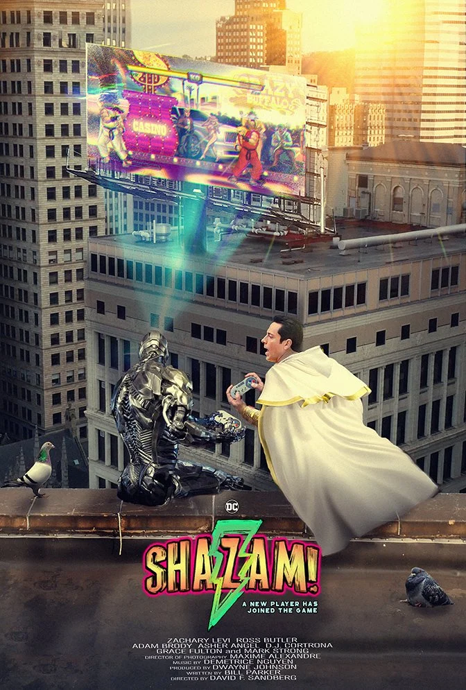 We’ve been seeing some fun, unofficial posters and pictures for Shazam! being put out by fans and even director, David F. Sandberg. We have a new one that features Shazam and Cyborg sitting on a rooftop playing Super Street Fighter 2 on a nearby billboard. One of my favorite parts is actually the tagline that the creator, Twitter user MessyPandas, added: “A New Player Has Joined the Game.” This is a very creative poster in my opinion and actor Zachary Levi even re-tweeted it, saying, “Round One! FIGHT!! #OldSchoolEpicness.”