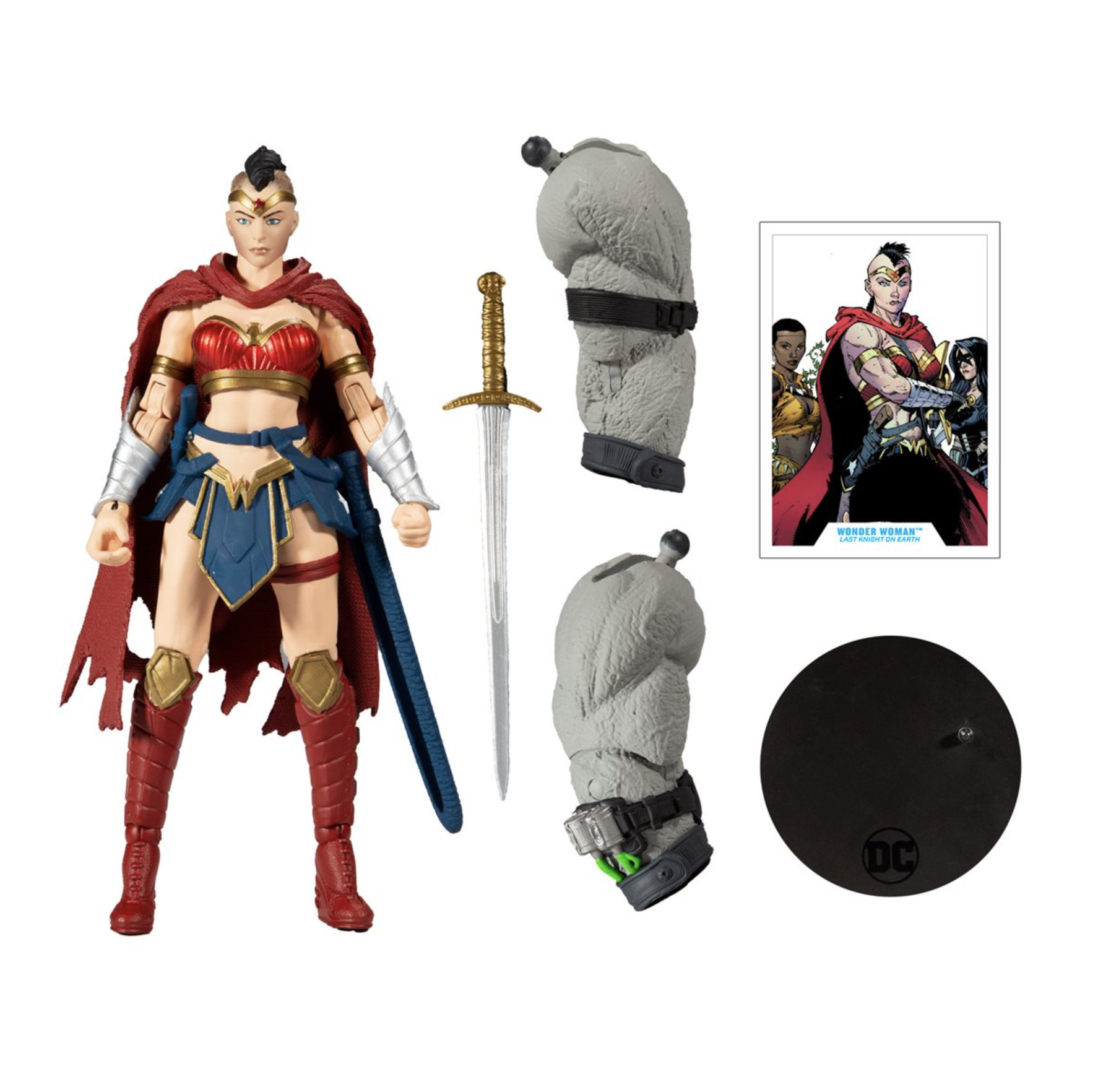 The DC Multiverse Collector Wave 3 Last Knight on Earth Wonder Woman Action Figure comes packaged in a blister box and comes with a Bane build-a-figure piece. Wonder Woman comes with a sword and base. The figure also includes a collectable art card with Last Knight on Earth #2 artwork on the front, and character biography on the back.