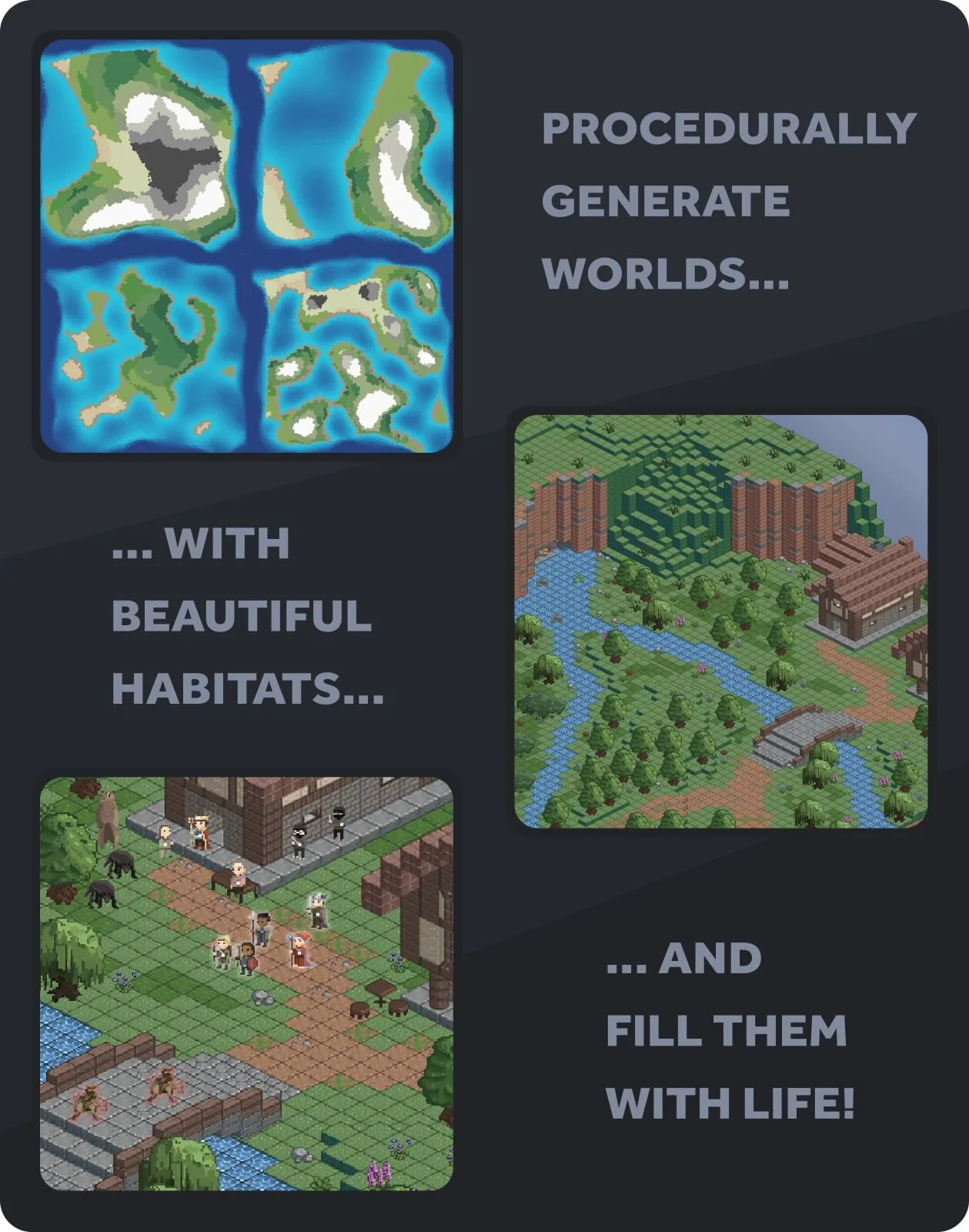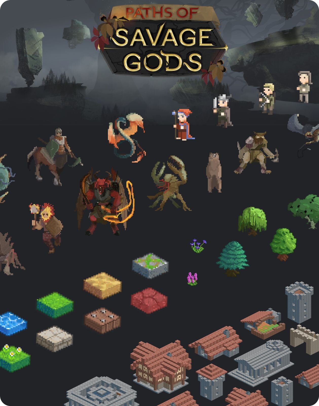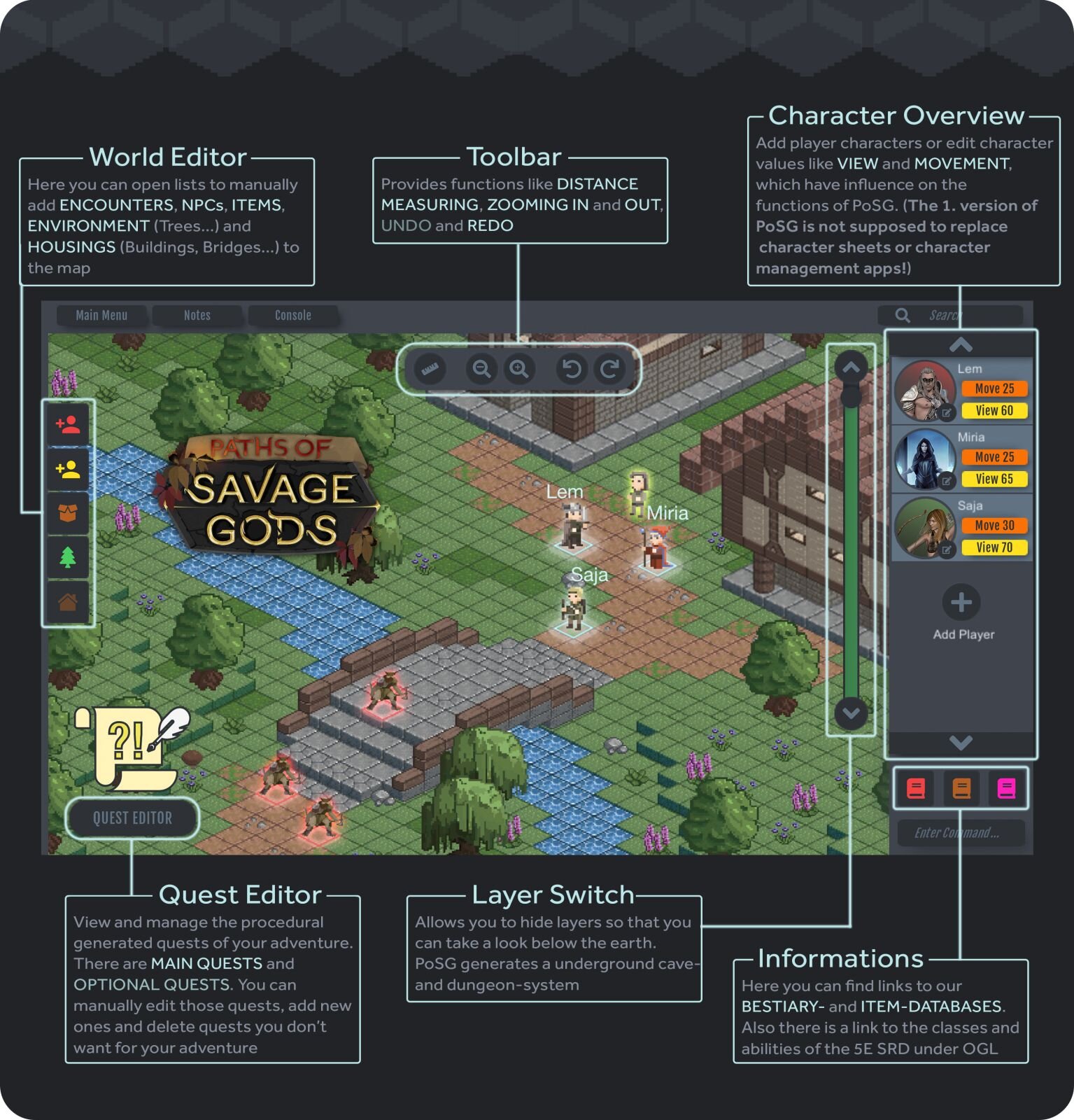 Paths of Savage Gods will provide tools for DMs to randomly generate maps of different sizes and scales, NPCs, encounters, quests, structures, and even points of interest. The DM can then go in and edit anything that they do not like. The tool will also serve as a functioning battle map with cute little figures. For character models, there will be some free pre-built models available, some premium models available from time to time, and even an option to upload your own custom models and icons.